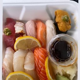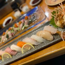 Cozy sushi bar, outdoor seating, friendly staff and service. Very expertly prepared sushi. Everything was fresh and delicious: sashimi, sushi and rolls. Complimentary miso soup and melon were a nice touch. Recommend.